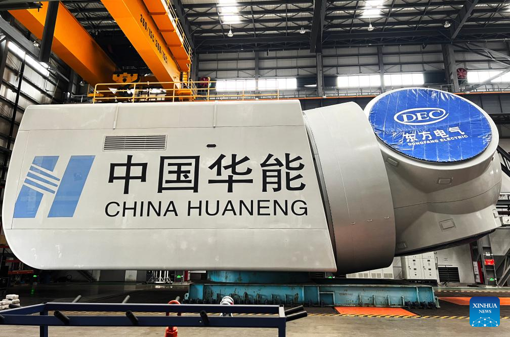 This undated photo shows the world's most powerful direct-drive floating wind turbine in Fuqing, southeast China's Fujian Province. China has achieved a major breakthrough in clean energy technology with the rollout of the world's most powerful direct-drive floating wind turbine. Jointly developed by state-owned enterprises China Huaneng Group and Dongfang Electric Corporation, the 17-megawatt turbine officially rolled off the production line on Thursday in Fujian Province's coastal city of Fuqing, China Huaneng Group confirmed to Xinhua on Saturday. (China Huaneng Group/Handout via Xinhua)