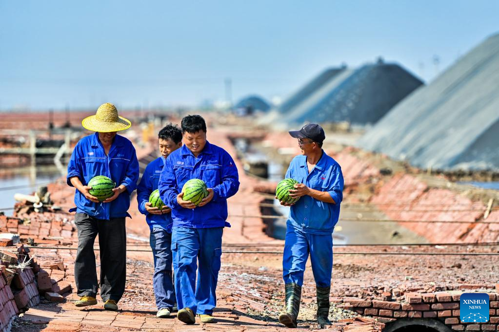 Workers claim watermelons as a summer refreshment at a salt field in north China's Tianjin Municipality, July 13, 2025. A heatwave is sweeping multiple regions in China, prompting authorities to roll out measures to ensure job safety and stable production. (Photo by Du Penghui/Xinhua)