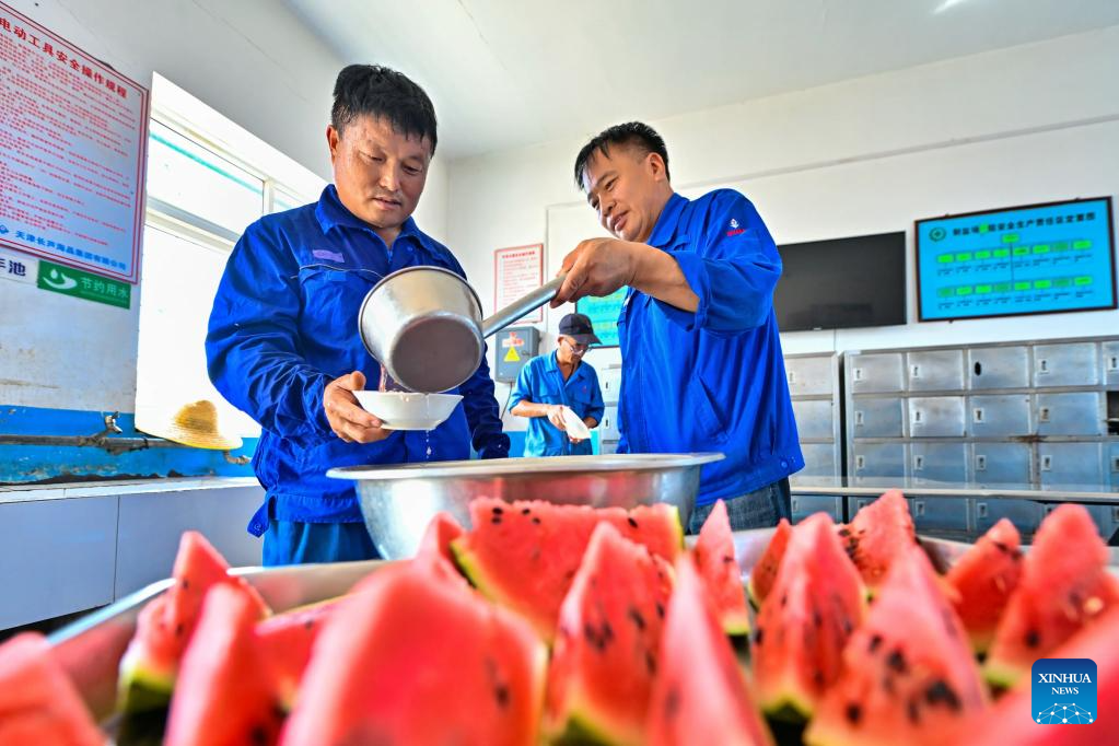 Workers have mung bean soup as a summer refreshment at a salt field in north China's Tianjin Municipality, July 13, 2025. A heatwave is sweeping multiple regions in China, prompting authorities to roll out measures to ensure job safety and stable production. (Photo by Du Penghui/Xinhua)