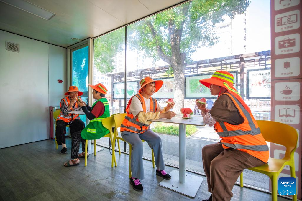 Sanitation workers have watermelon as a summer refreshment at a devoted lounge in Xinghua City of east China's Jiangsu City, July 13, 2025. A heatwave is sweeping multiple regions in China, prompting authorities to roll out measures to ensure job safety and stable production. (Photo by Zhou Shegen/Xinhua)