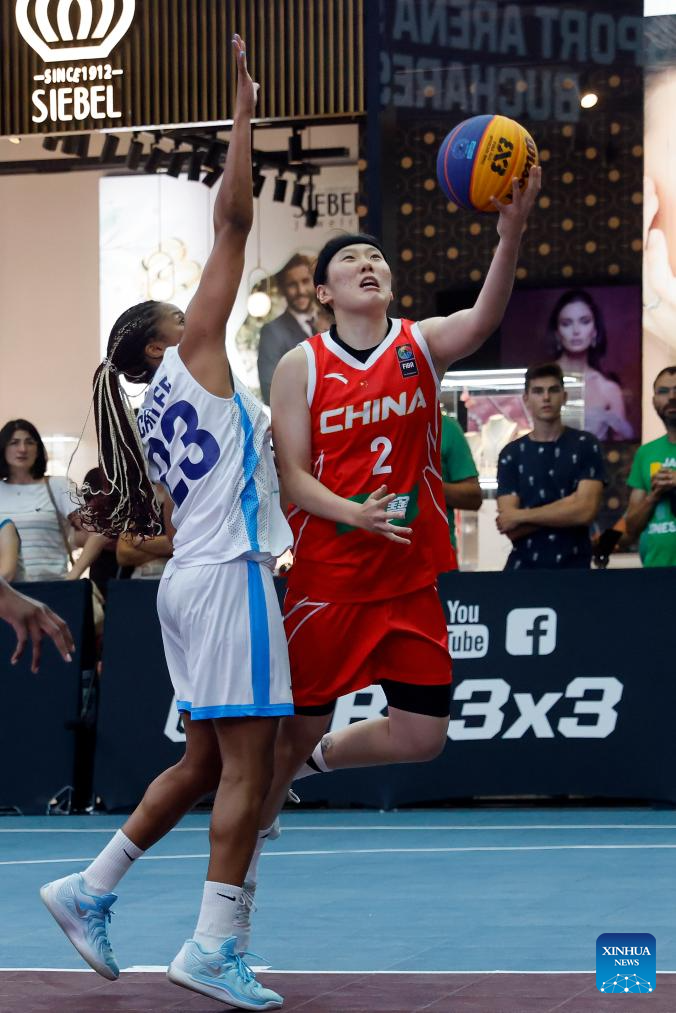 China's Hu Duoling (R) goes for a lay-up during the FIBA 3X3 Women's Series basketball match between China and Azerbaijan at Parklake mall in Bucharest, Romania, July 13, 2025. (Photo by Cristian Cristel/Xinhua)