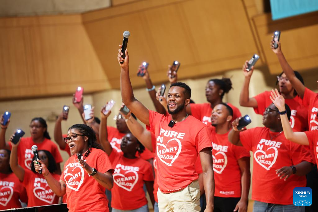 Choir members from a Chinese middle school perform in Beijing, capital of China, July 14, 2025. Bond with Kuliang: 2025 China-U.S. Youth Choir Festival, with the theme of "Singing for Peace," is held in Beijing and Fuzhou from July 9 to 18.