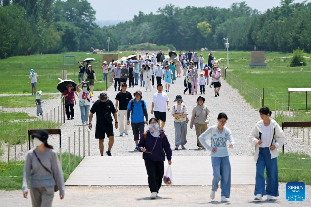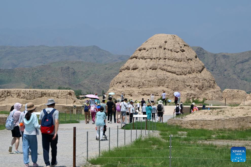 Tourists visit the Xixia Imperial Tombs archaeological site park in Yinchuan, northwest China's Ningxia Hui Autonomous Region, July 13, 2025. China's Xixia Imperial Tombs were officially added to the UNESCO World Heritage List on Friday during the 47th session of the World Heritage Committee held in Paris, France. (Photo by Yuan Hongyan/Xinhua)