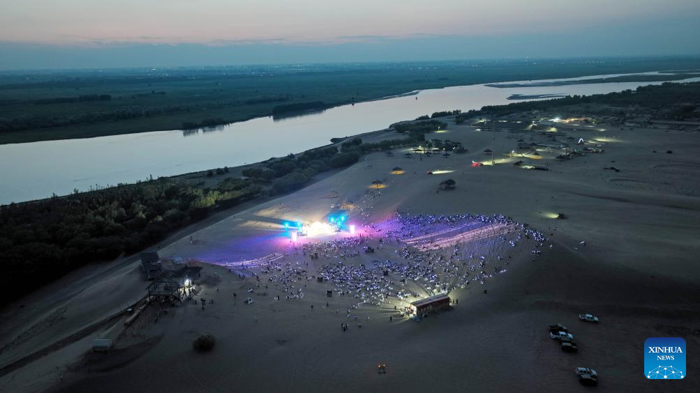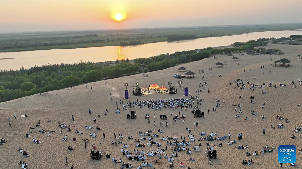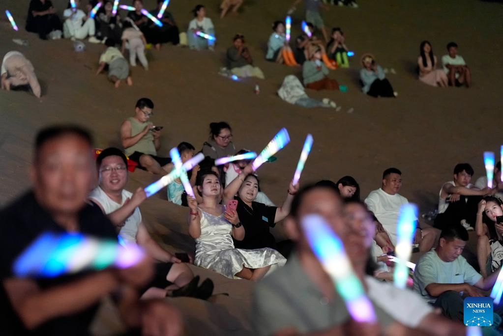 People enjoy a performance at a scenic area in Yinchuan, northwest China's Ningxia Hui Autonomous Region, July 13, 2025. (Xinhua/Wang Peng)