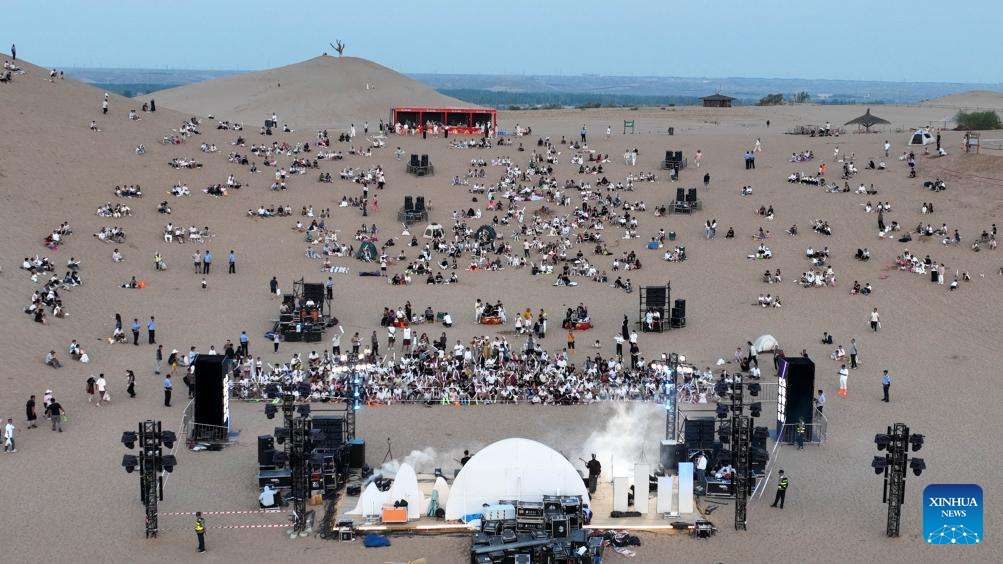 An aerial drone photo taken on July 13, 2025 shows people enjoying a performance at a scenic area in Yinchuan, northwest China's Ningxia Hui Autonomous Region. (Xinhua/Wang Peng)