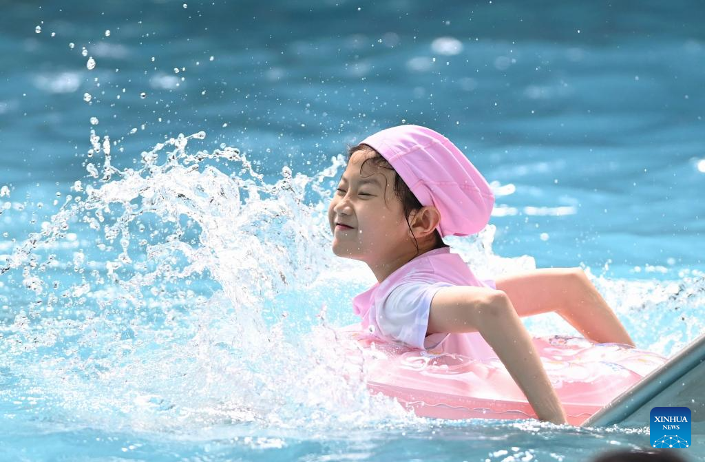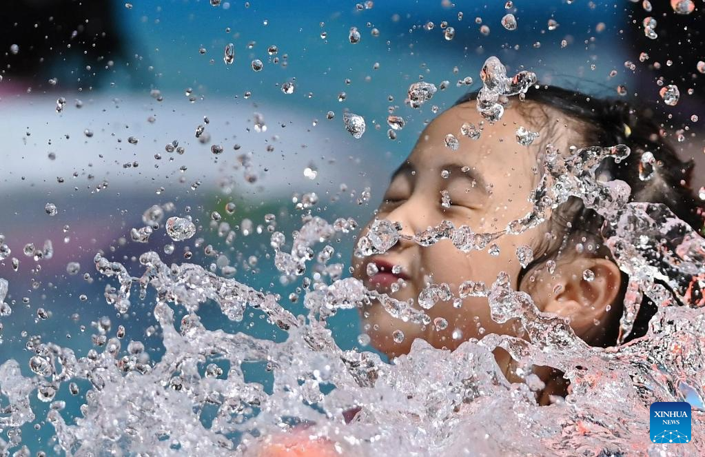 A girl enjoys herself in water at a water world in Zaozhuang City, east China's Shandong Province, July 12, 2025. High temperature during the summer vacation has triggered new vitality of cooling economy across the country. (Photo by Li Zhijun/Xinhua)