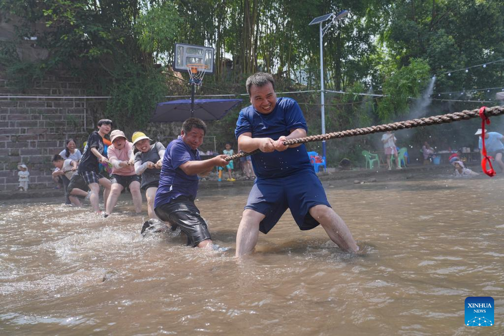 Villagers take part in a fun tug-of-war game in water at the ancient town of Pianyan, southwest China's Chongqing Municipality, July 12, 2025. High temperature during the summer vacation has triggered new vitality of cooling economy across the country. (Photo by Qin Tingfu/Xinhua)