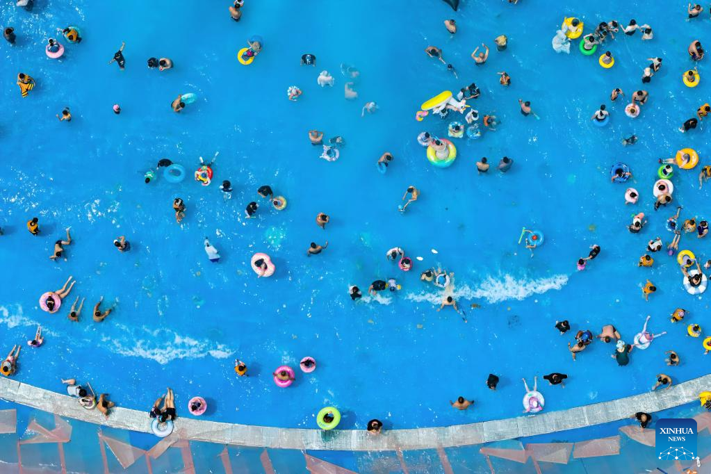 A drone photo taken on July 12, 2025 shows visitors enjoying themselves at Fantawild Water Park in north China's Tianjin Municipality. High temperature during the summer vacation has triggered new vitality of cooling economy across the country. (Photo by Du Penghui/Xinhua)