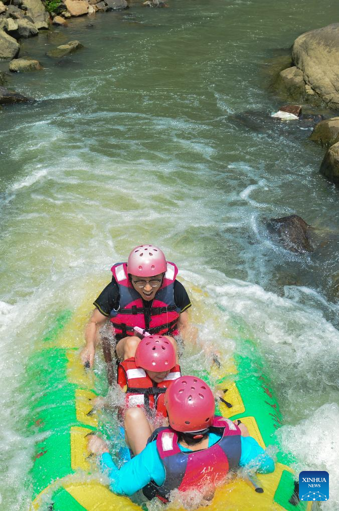 Visitors drift at the Xianren canyon in Sanmen County of east China's Zhejiang Province, July 12, 2025. High temperature during the summer vacation has triggered new vitality of cooling economy across the country. (Photo by Lin Lijun/Xinhua)