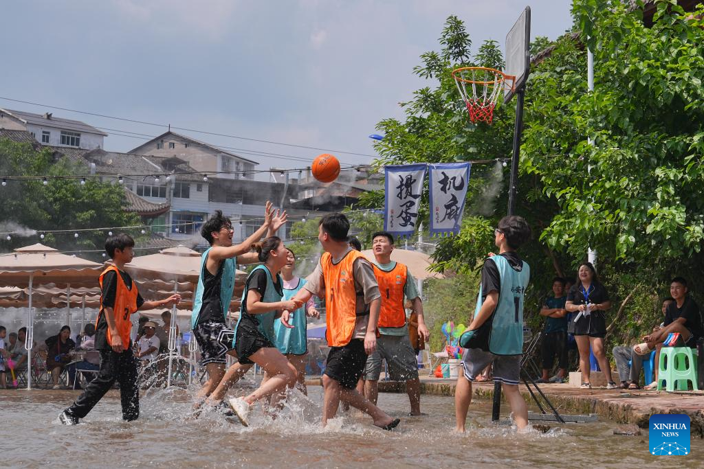 Villagers take part in a fun basketball game in water at the ancient town of Pianyan, southwest China's Chongqing Municipality, July 12, 2025. High temperature during the summer vacation has triggered new vitality of cooling economy across the country. (Photo by Qin Tingfu/Xinhua)