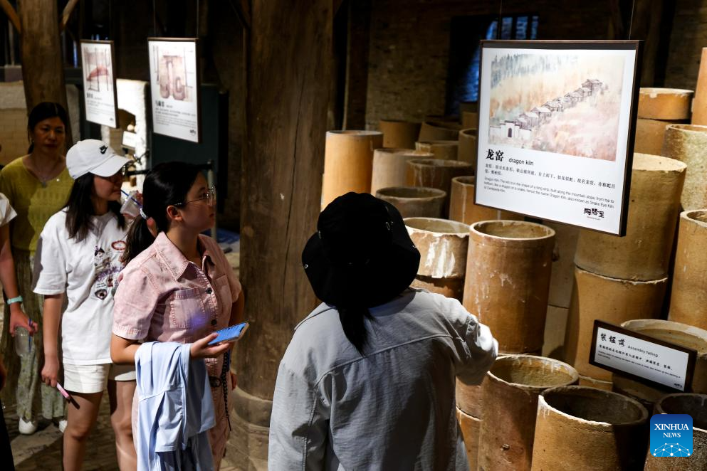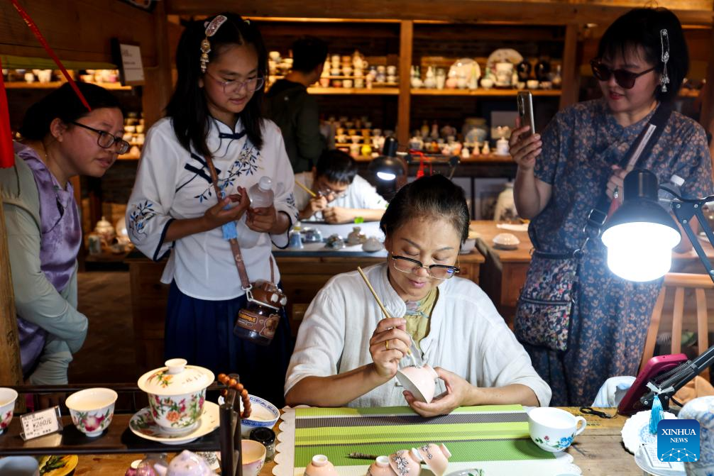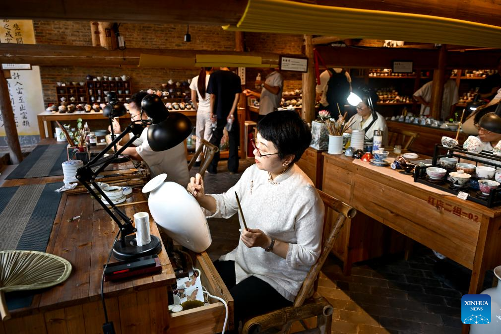 Artisans make ceramic products in Taoyangli historical and cultural block in Jingdezhen City, east China's Jiangxi Province, July 13, 2025. Located in the heart of Jingdezhen, Taoyangli has successfully transformed from an old district into a thriving hub for cultural innovation and tourism in recent years. Today, it has become a must-visit destination for tourists. (Xinhua/Liu Jinhai)