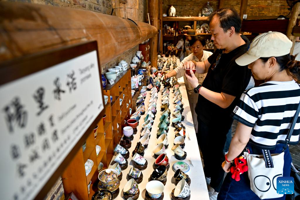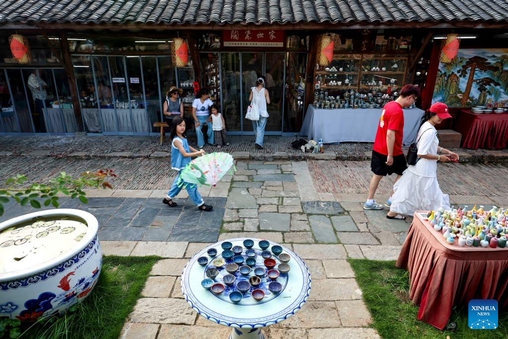 Tourists shop for handmade ceramic products in Taoyangli historical and cultural block in Jingdezhen City, east China's Jiangxi Province, July 13, 2025. Located in the heart of Jingdezhen, Taoyangli has successfully transformed from an old district into a thriving hub for cultural innovation and tourism in recent years. Today, it has become a must-visit destination for tourists. (Xinhua/Liu Jinhai)