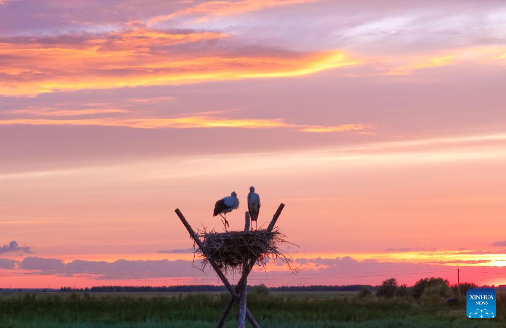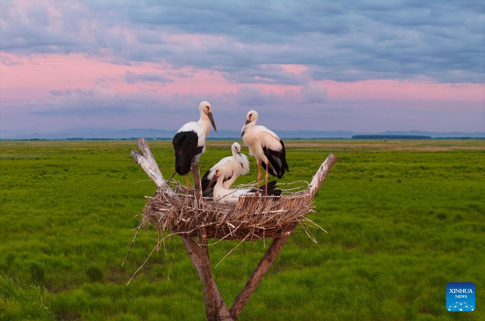 In pics: oriental white storks in artificial nests in Fujin City, NE China
