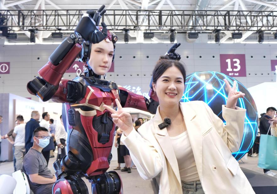 A visitor poses for a picture with a humanoid robot at the 21st China (Shenzhen) International Cultural Industries Fair in Shenzhen, south China's Guangdong province, May 23, 2025. (Photo by Yang Jie/People's Daily Online)