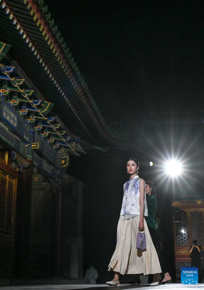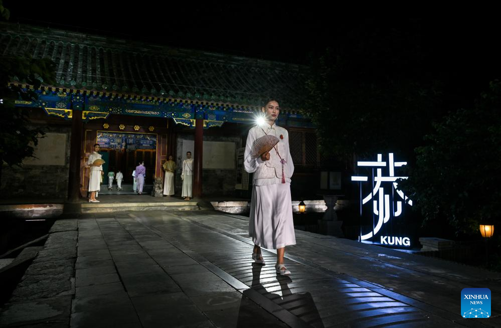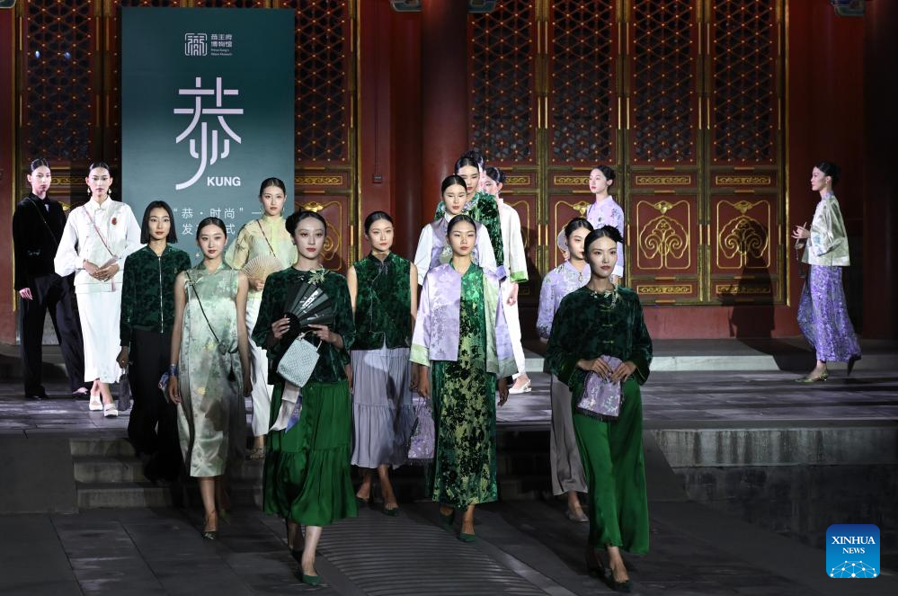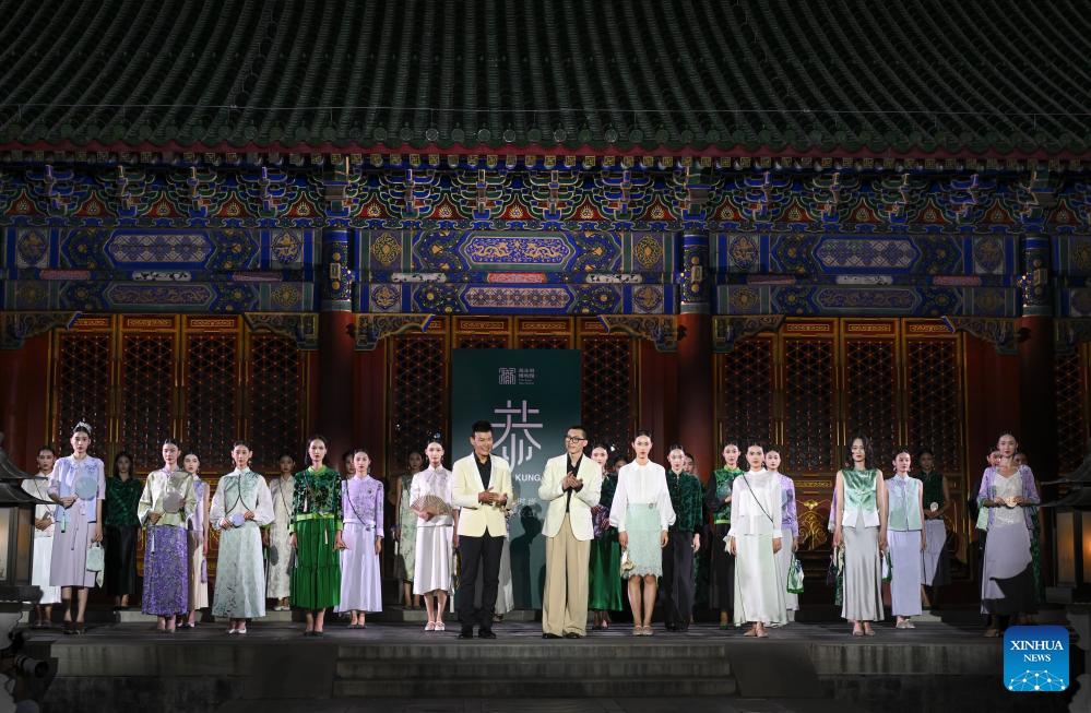 Models present neo-Chinese ready-to-wear designs during a fashion show held at the Prince Kung's Palace Museum in Beijing, capital of China, July 14, 2025. The fashion show is inspired by elements of the Prince Kung's Palace Museum and Chinese intangible cultural heritages, displaying 37 concept creations as well as 35 neo-Chinese ready-to-wear and accessories. (Xinhua/Jin Liangkuai)