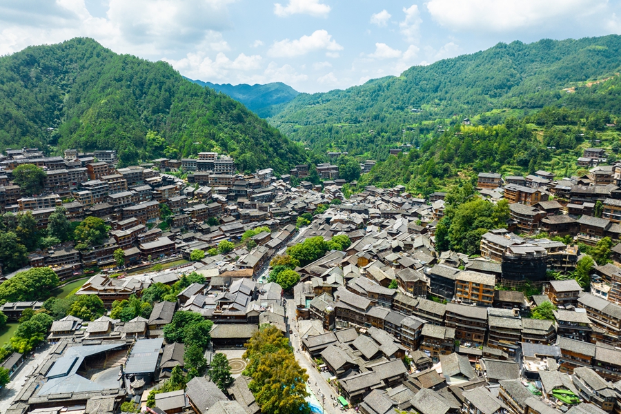An aerial shot captures Xijiang Qianhu Miao Village, Leishan county, Qiandongnan Miao and Dong Autonomous Prefecture, southwest China's Guizhou Province. (Photo/Yang Qian)