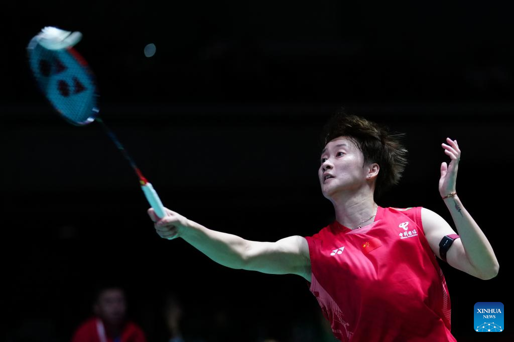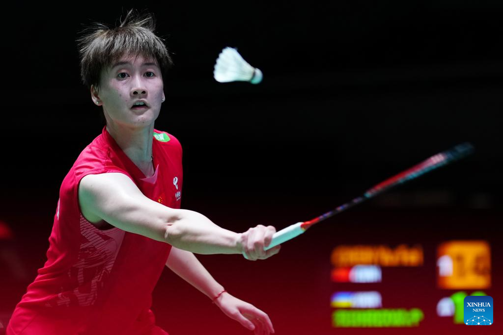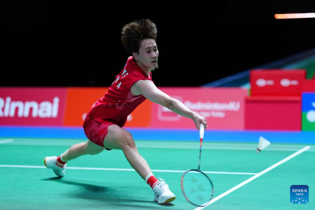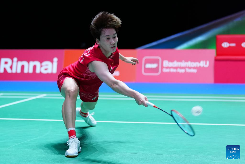 Chen Yufei hits a return during the women's singles round of 32 match between Chen Yufei of China and Polina Buhrova of Ukraine at the Japan Badminton Open 2025 in Tokyo, Japan, July 15, 2025. (Xinhua/Jia Haocheng)