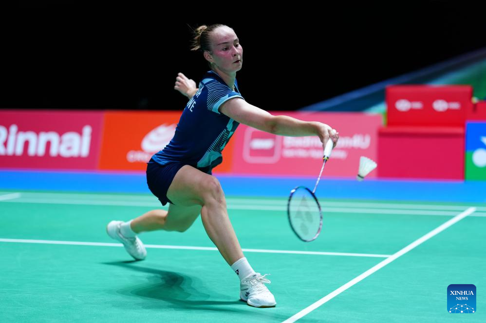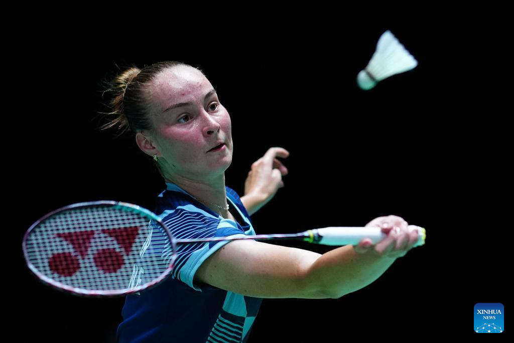 Polina Buhrova hits a return during the women's singles round of 32 match between Chen Yufei of China and Polina Buhrova of Ukraine at the Japan Badminton Open 2025 in Tokyo, Japan, July 15, 2025. (Xinhua/Jia Haocheng)