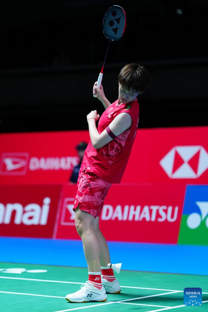 Chen Yufei reacts during the women's singles round of 32 match between Chen Yufei of China and Polina Buhrova of Ukraine at the Japan Badminton Open 2025 in Tokyo, Japan, July 15, 2025. (Xinhua/Jia Haocheng)