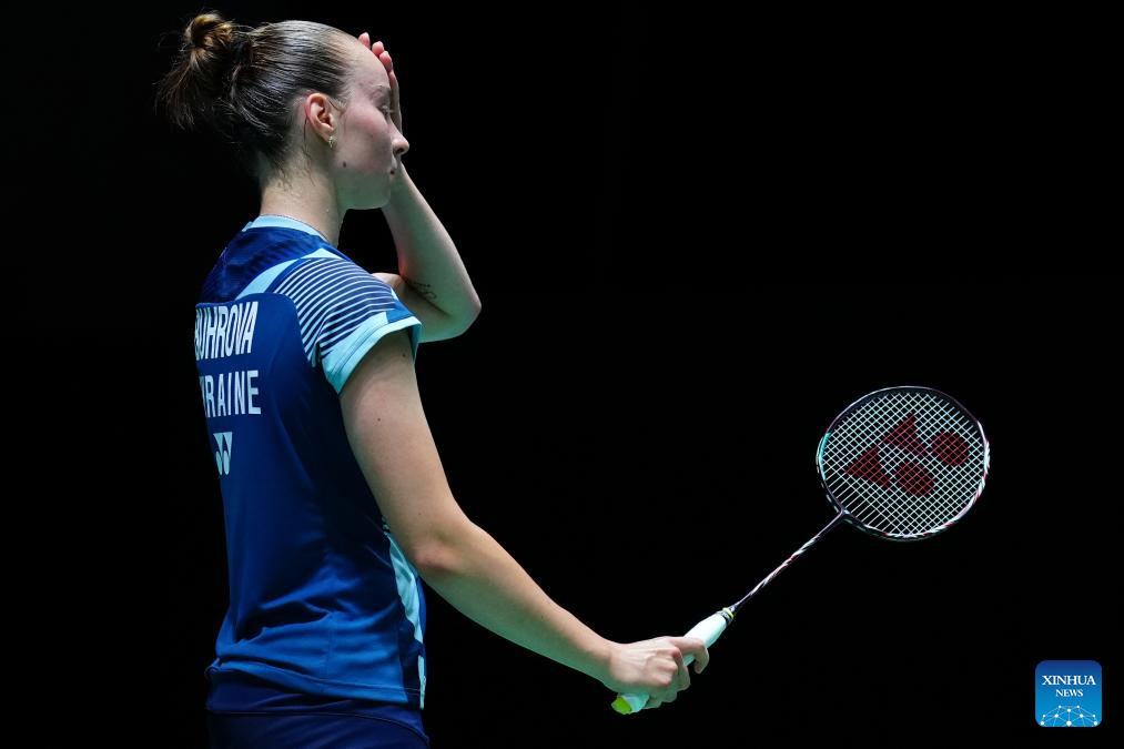 Polina Buhrova reacts during the women's singles round of 32 match between Chen Yufei of China and Polina Buhrova of Ukraine at the Japan Badminton Open 2025 in Tokyo, Japan, July 15, 2025. (Xinhua/Jia Haocheng)