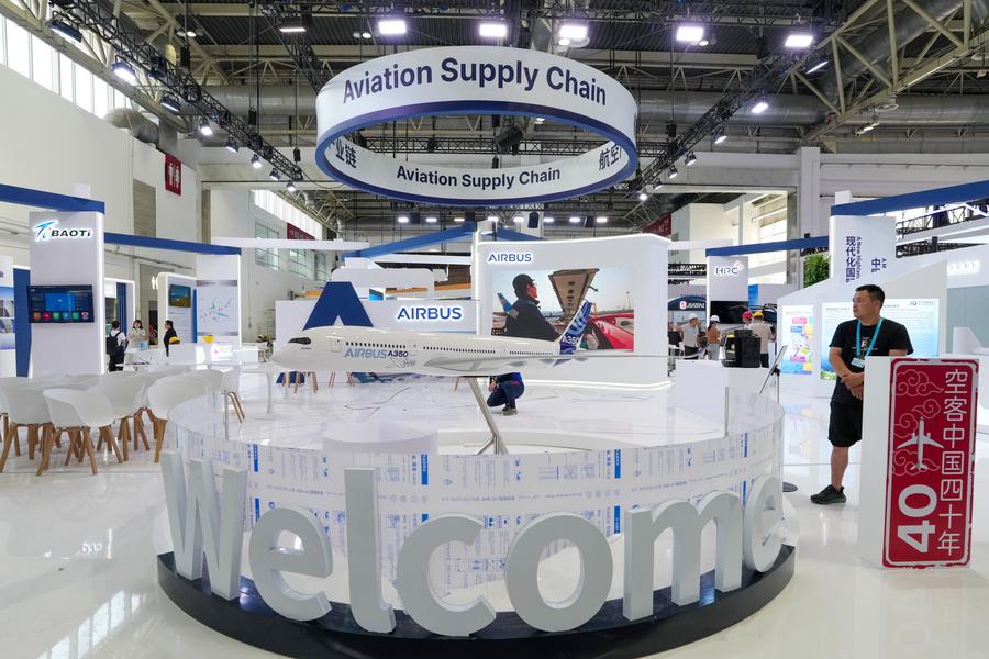 This photo taken on July 14, 2025 shows the booth of aviation supply chain at the advanced manufacturing section of the upcoming third China International Supply Chain Expo (CISCE) in Beijing, capital of China. (Xinhua/Ju Huanzong)