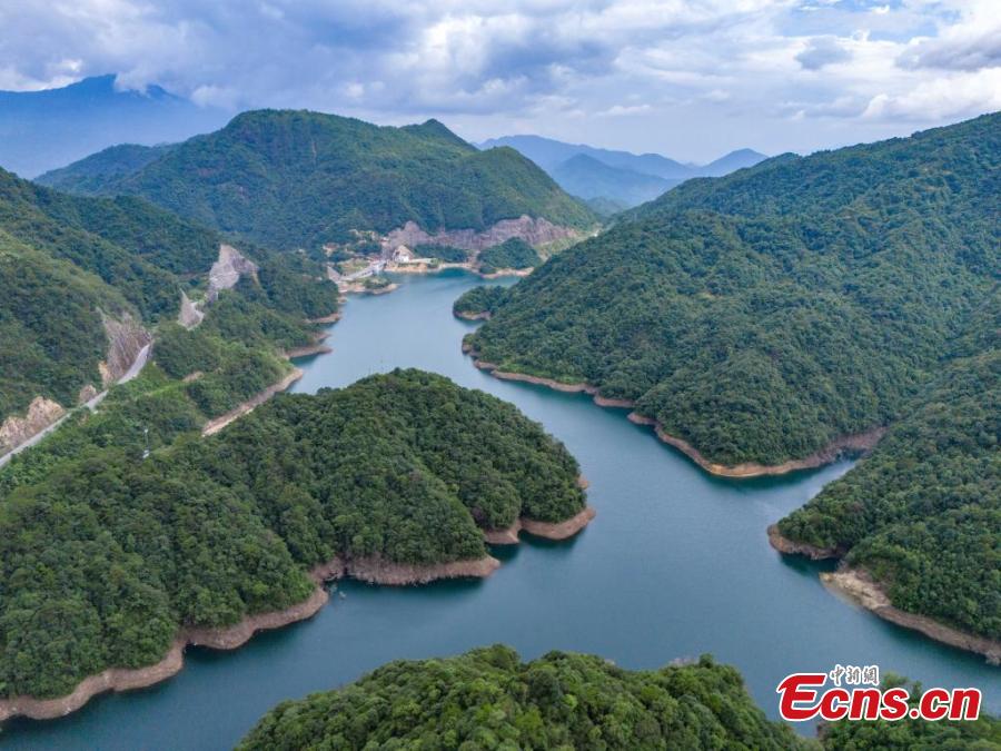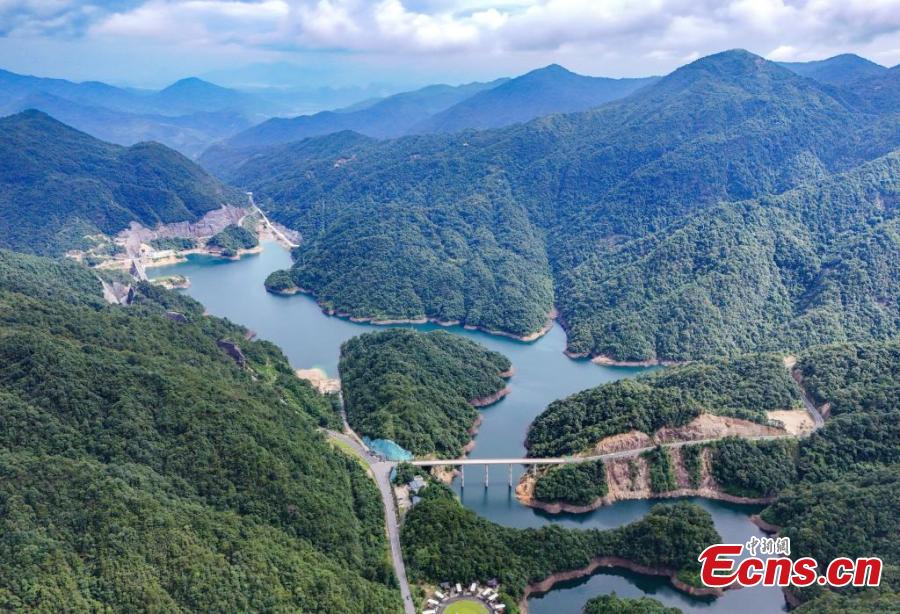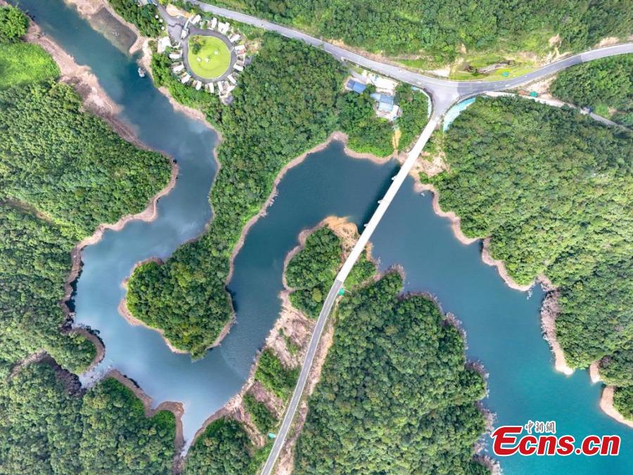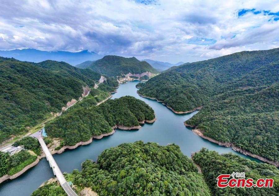 Aerial shot captures the scenic beauty of Luhua Reservoir nestled among the verdant hills of Hezhou, Guangxi Zhuang Autonomous Region. (Photo: China News Service/ Li Haotu)