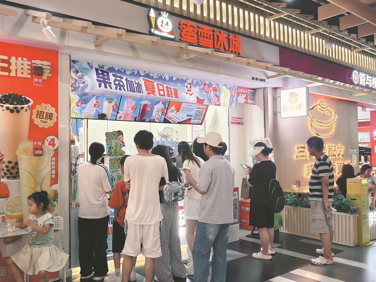 Consumers claim free drink exchange coupons for brands such as Mixue through the Meituan app, leading to a surge in orders at a store in Chengdu, Sichuan province, in July. CHINA DAILY