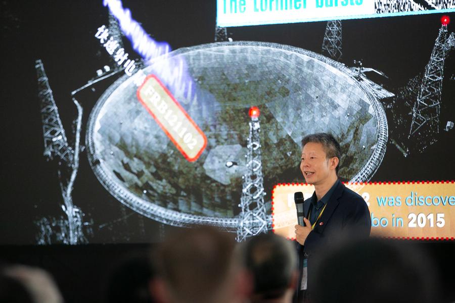 Chinese radio astronomer Li Di, the chief scientist of China's Five-hundred-meter Aperture Spherical Radio Telescope (FAST), makes a speech at the 17th Marcel Grossmann Meeting in Pescara, Italy, July 9, 2024. (Xinhua/Li Jing)