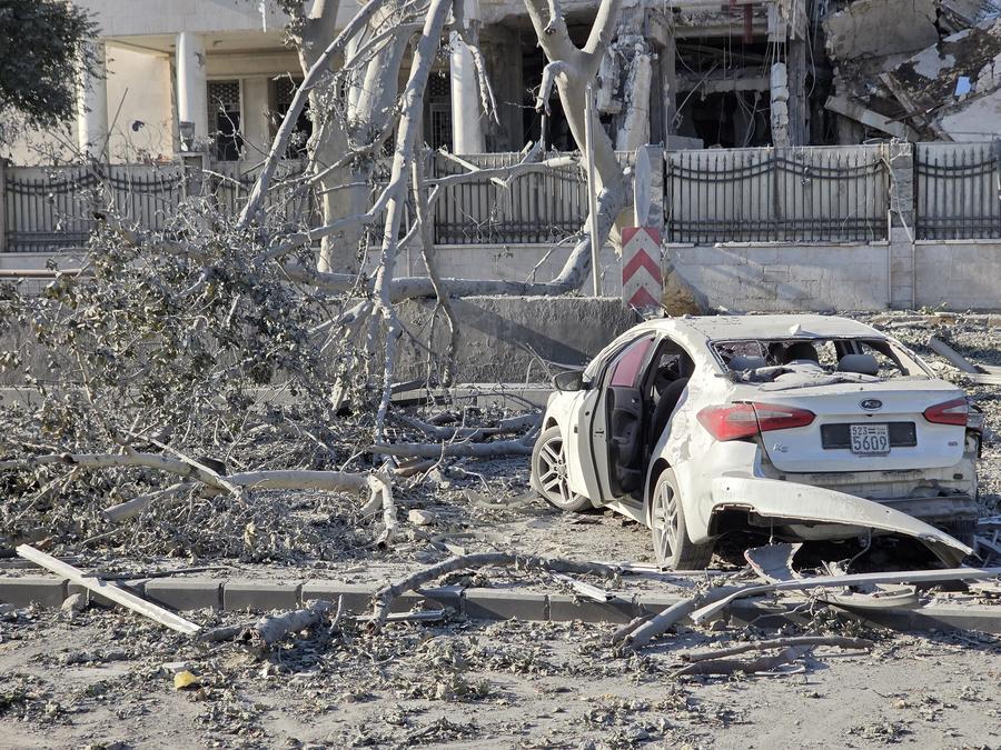 A damaged car is seen after Israel struck the Syrian Army General Command and the Defense Ministry compound in Umayyad Square in central Damascus, Syria, July 16, 2025. (Str/Xinhua)