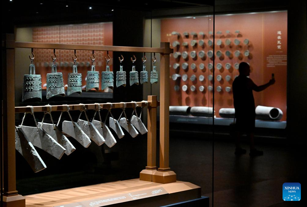A visitor takes photos of an exhibition at the Han-Wei Luoyang Ancient City Site Museum in Luoyang, central China's Henan Province, July 16, 2025. The museum showcasing over 1,300 sets of cultural relics opened to public on Wednesday. (Xinhua/Hao Yuan)