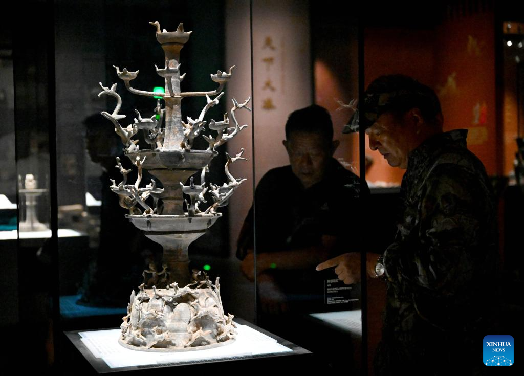 Visitors view an exhibition at the Han-Wei Luoyang Ancient City Site Museum in Luoyang, central China's Henan Province, July 16, 2025. The museum showcasing over 1,300 sets of cultural relics opened to public on Wednesday. (Xinhua/Hao Yuan)