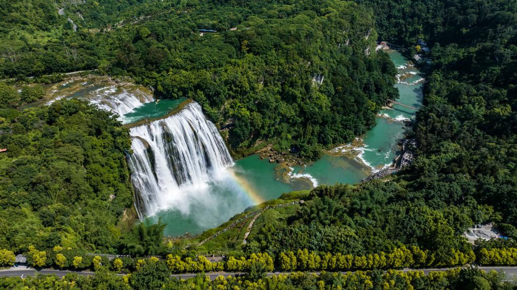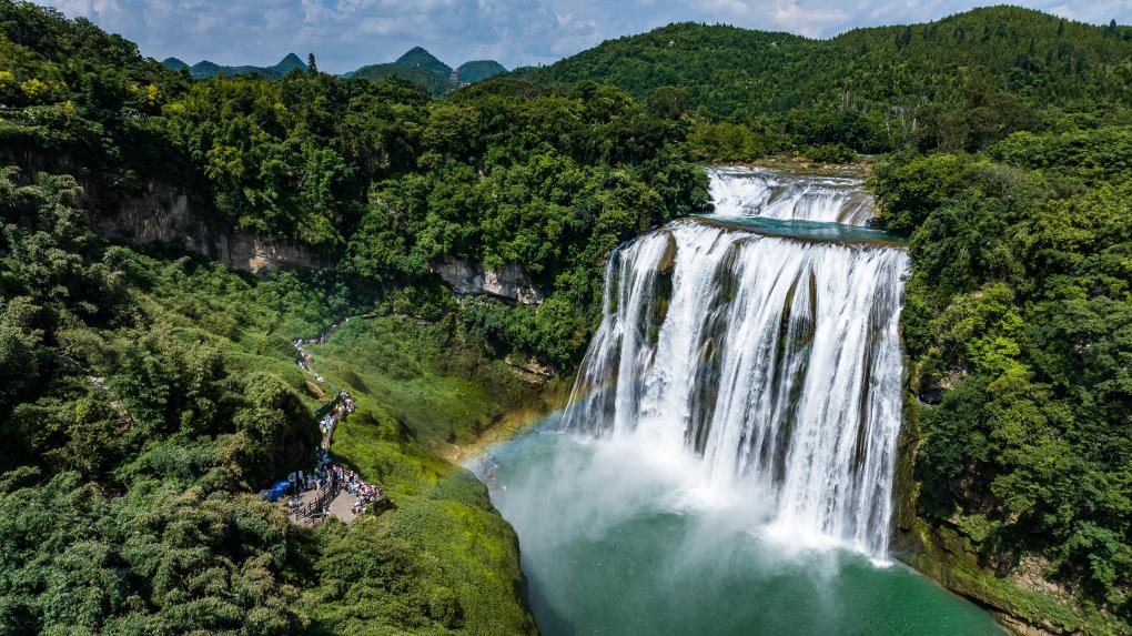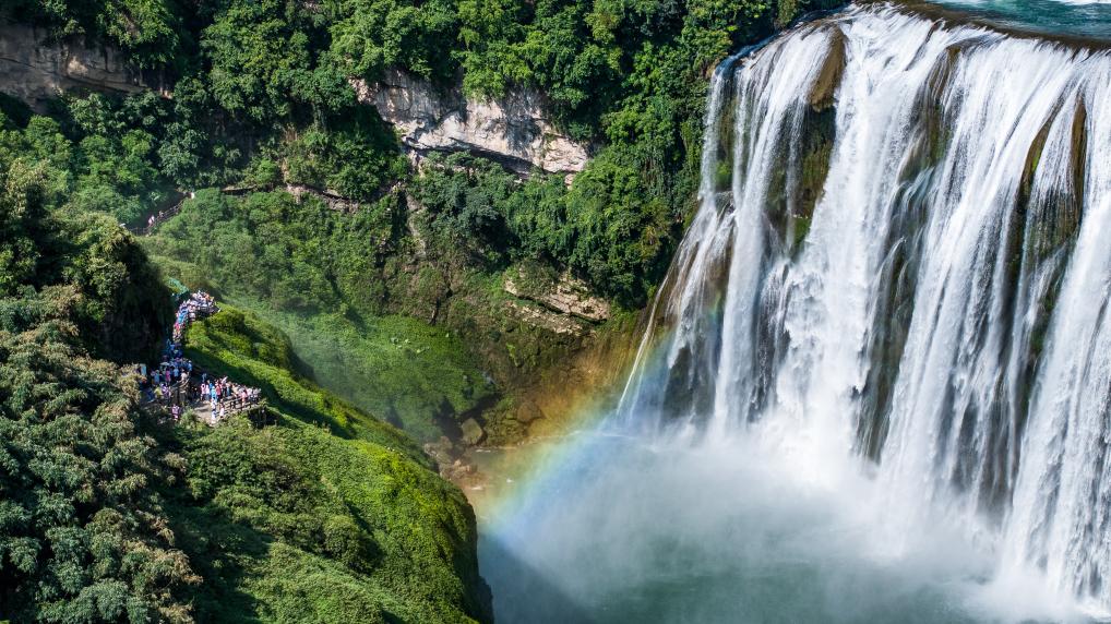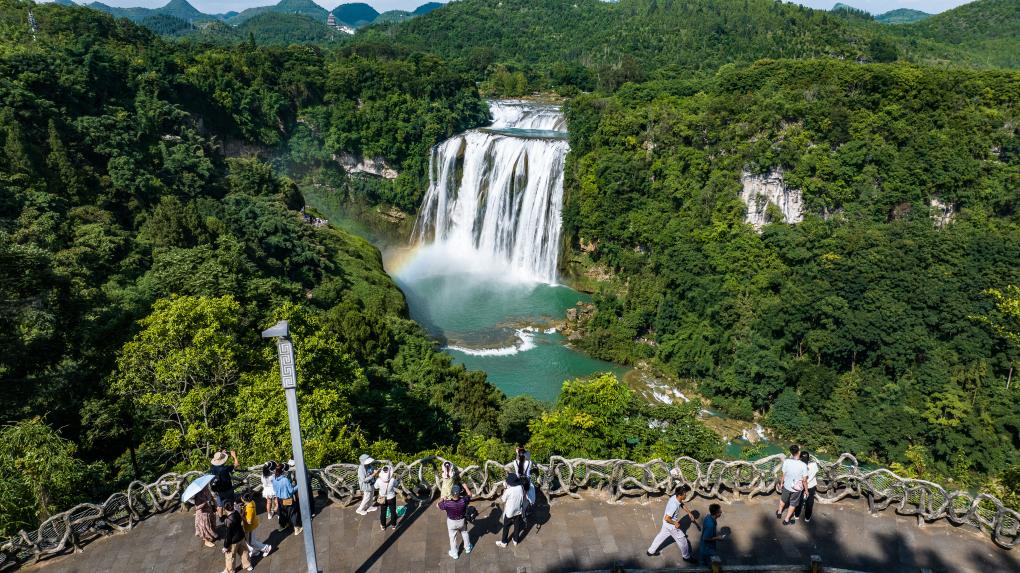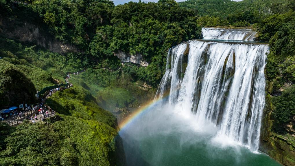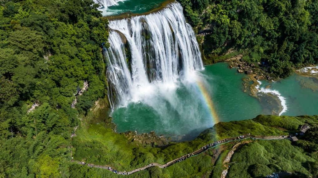 An aerial drone photo taken on July 16, 2025 shows tourists visiting Huangguoshu waterfall scenic area in Anshun, southwest China's Guizhou Province. (Xinhua/Tao Liang)