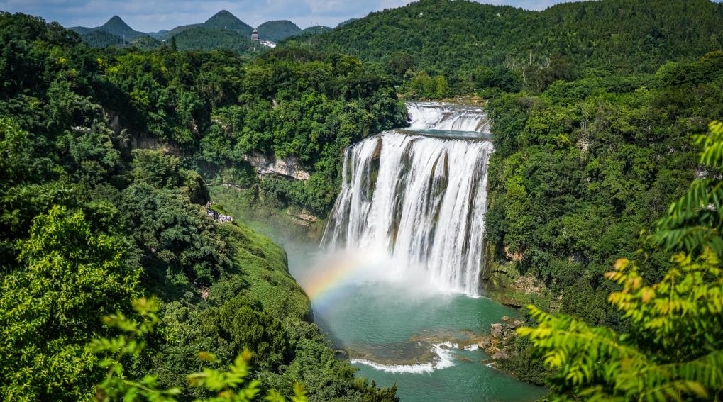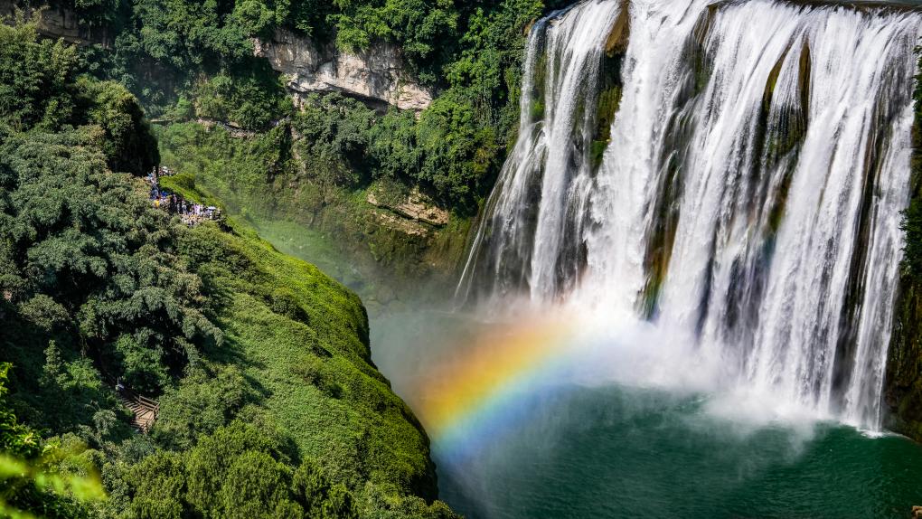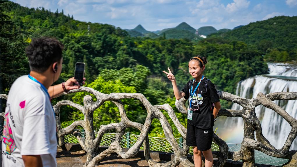 Tourists take photos at Huangguoshu waterfall scenic area in Anshun, southwest China's Guizhou Province, July 16, 2025. (Xinhua/Tao Liang)