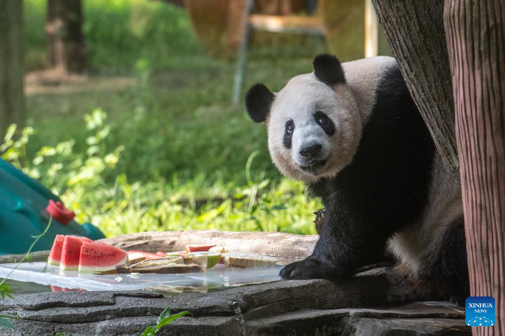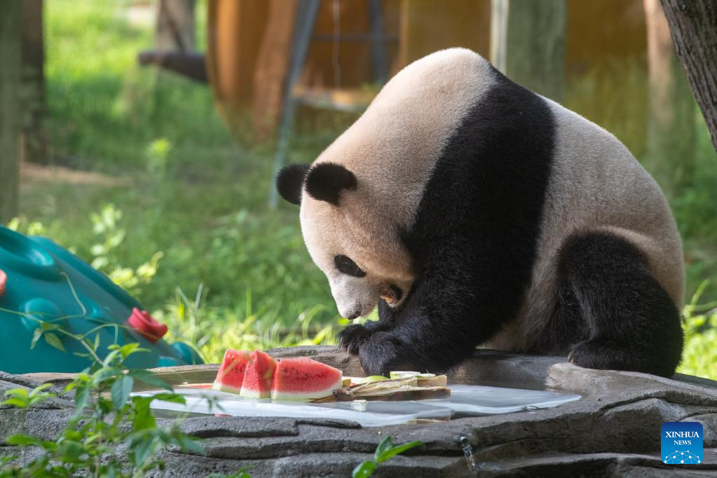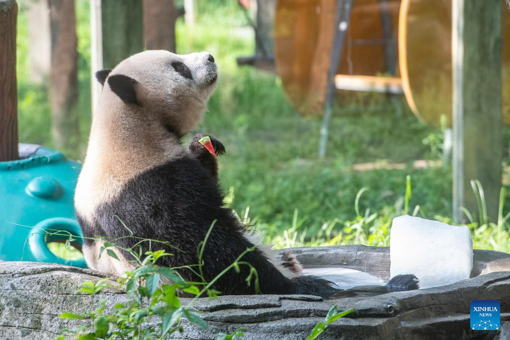 A giant panda enjoys iced watermelon at the Chongqing Zoo in southwest China's Chongqing Municipality, July 16, 2025. As the high temperature continues in Chongqing, the Chongqing Zoo has taken various measures to help animals beat the summer heat, including offering ice baths, providing air conditioning, and feeding animals with iced treats, all to ensure their safety and comfort throughout the season. (Xinhua/Tang Yi)