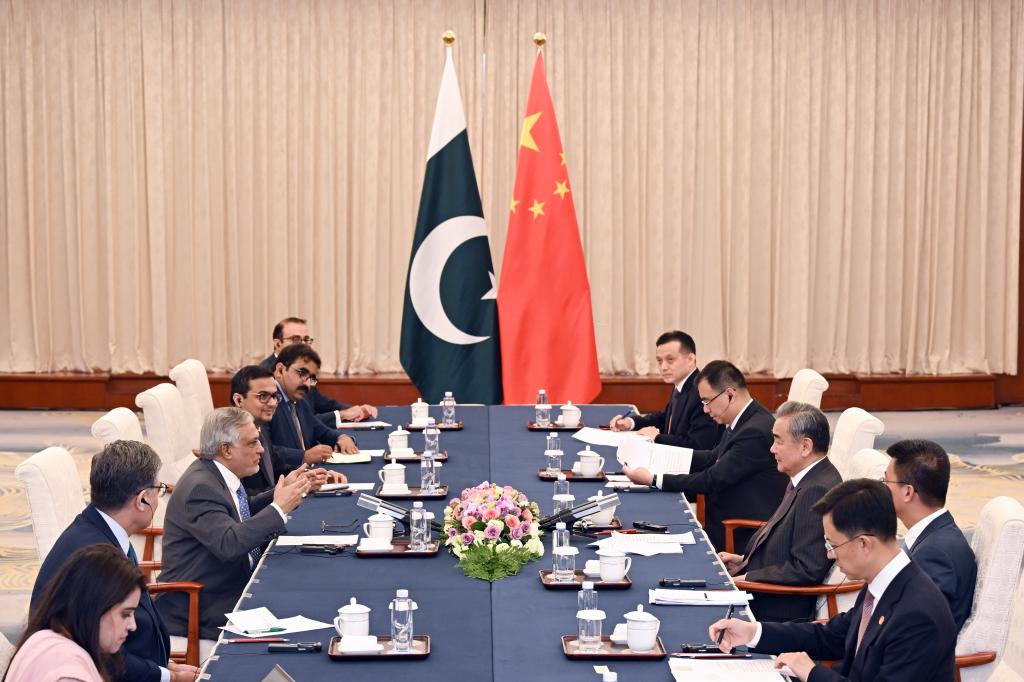 Chinese Foreign Minister Wang Yi, also a member of the Political Bureau of the Communist Party of China Central Committee, meets with Pakistani Deputy Prime Minister and Foreign Minister Mohammad Ishaq Dar in Tianjin, north China, July 16, 2025. (Xinhua/Zhao Zishuo)