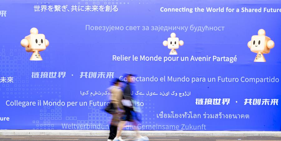 People walk past a poster during the third China International Supply Chain Expo (CISCE) in Beijing, capital of China, July 16, 2025. (Xinhua/Chen Shuo)