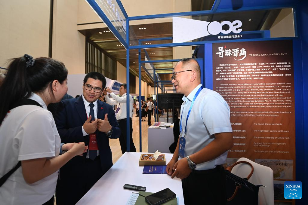 Representatives learn about the audio-visual products of Shanxi Radio and Television Station during the 2nd television festival of Shanghai Cooperation Organization (SCO) countries in Xi'an, northwest China's Shaanxi Province, July 16, 2025. The festival opened here on Wednesday. About 300 representatives from the SCO member states, observer states and dialogue partners attended the opening ceremony. (Xinhua/Li Yibo)