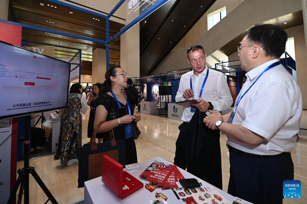 Representatives visit the booth of YoyWow during the 2nd television festival of Shanghai Cooperation Organization (SCO) countries in Xi'an, northwest China's Shaanxi Province, July 16, 2025. The festival opened here on Wednesday. About 300 representatives from the SCO member states, observer states and dialogue partners attended the opening ceremony. (Xinhua/Li Yibo)