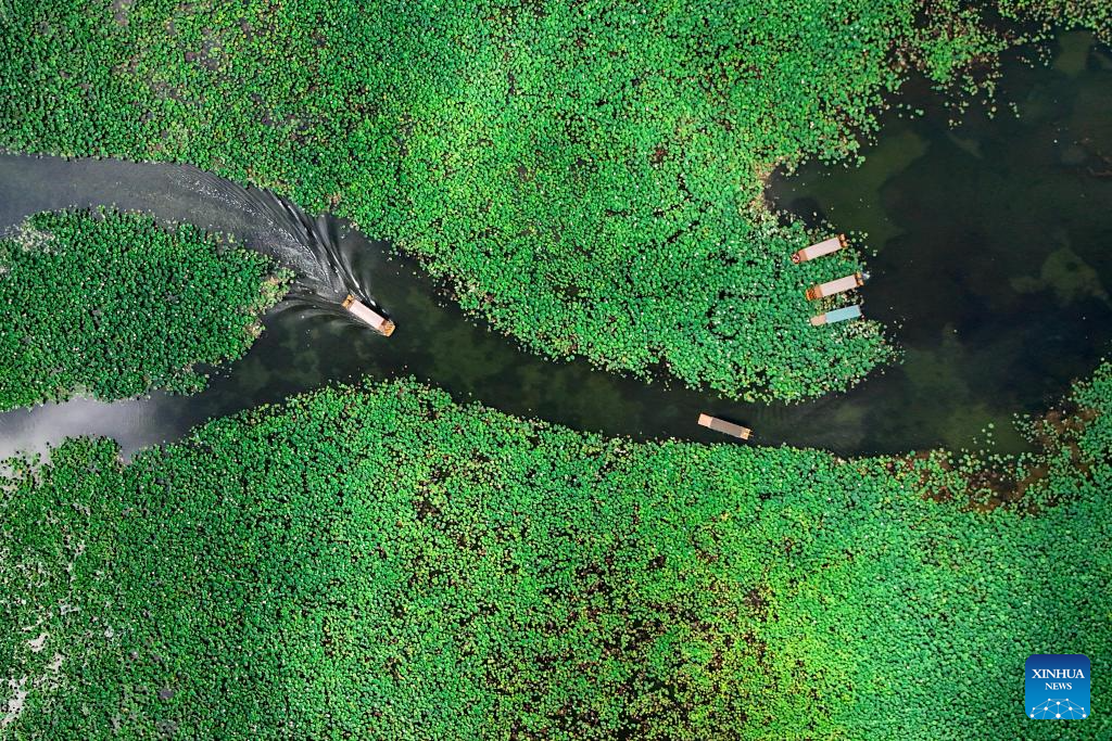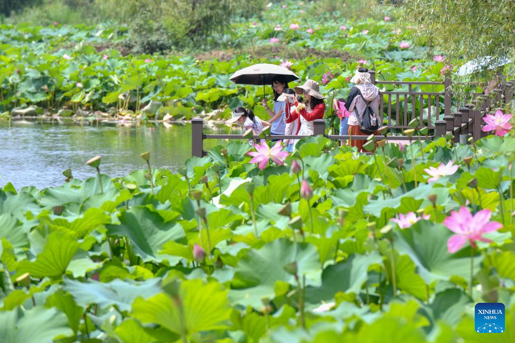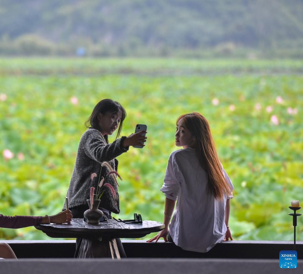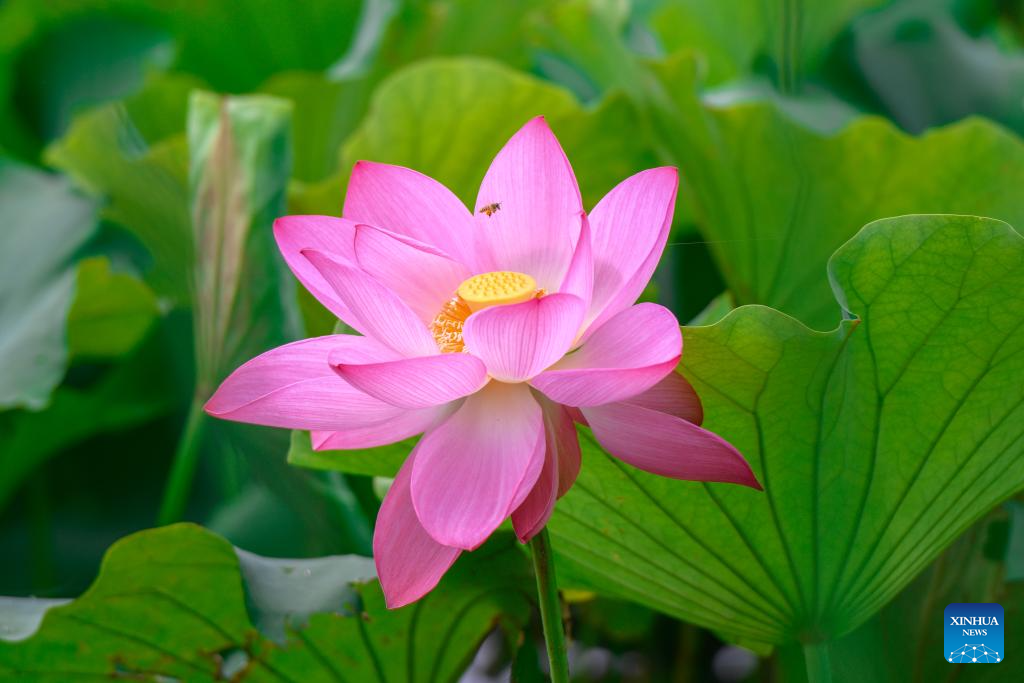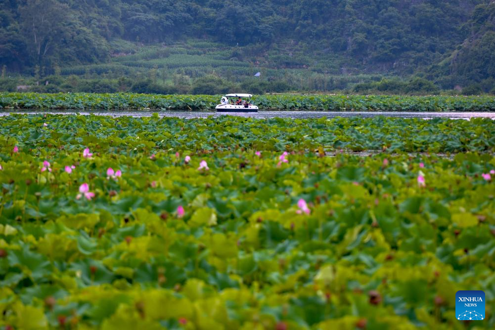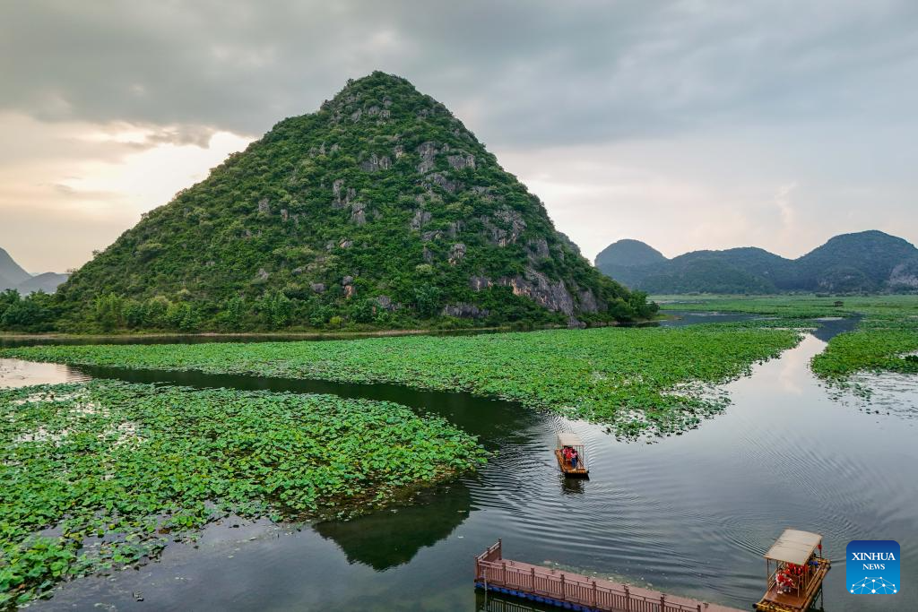 This photo taken on July 16, 2025 shows a blooming lotus at the Puzhehei scenic area in Qiubei County, Wenshan Zhuang and Miao Autonomous Prefecture, southwest China's Yunnan Province. The beautiful scenery of Puzhehei, along with the rich amusement facilities there, has attracted lots of visitors during the summer. (Photo by Peng Yikai/Xinhua)