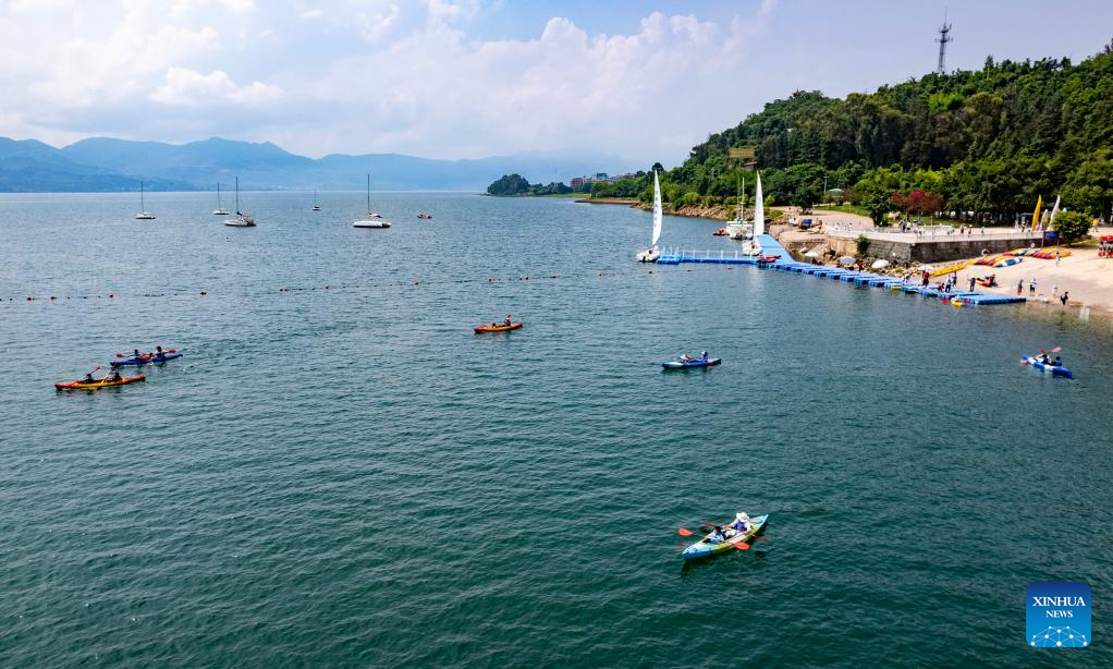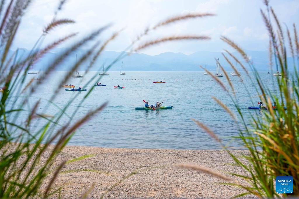 Tourists enjoys kayaking on Fuxian Lake in Yuxi City, southwest China's Yunnan Province on July 16, 2025. The beautiful scenery of Fuxian Lake in summer has attracted tourists nationwide. (Xinhua/Chen Xinbo)