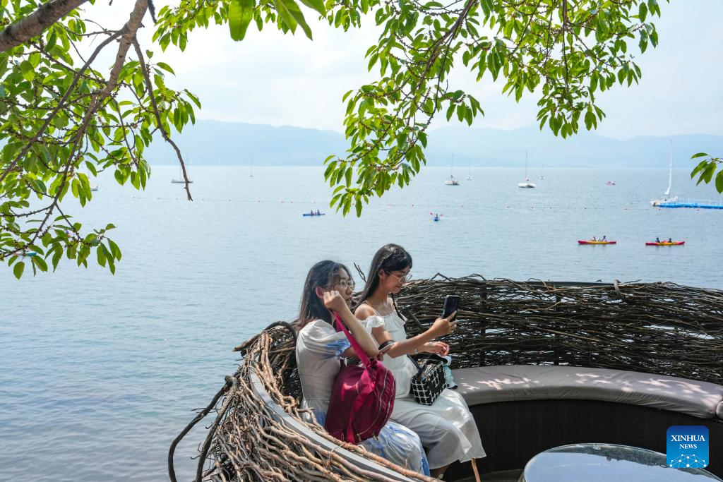 Tourists take a rest at a coffee shop by Fuxian Lake in Yuxi City, southwest China's Yunnan Province The beautiful scenery of Fuxian Lake in summer has attracted tourists nationwide. (Xinhua/Chen Xinbo)
