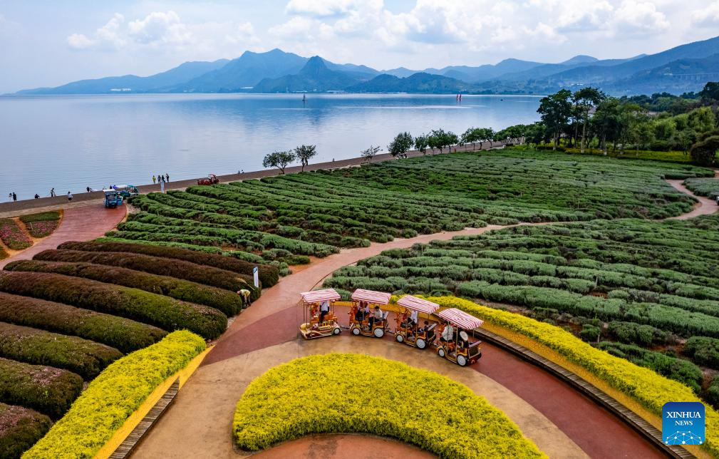 A drone photo taken on July 16, 2025 shows tourists taking a sightseeing bus by Fuxian Lake in Yuxi City, southwest China's Yunnan Province. The beautiful scenery of Fuxian Lake in summer has attracted tourists nationwide. (Xinhua/Chen Xinbo)