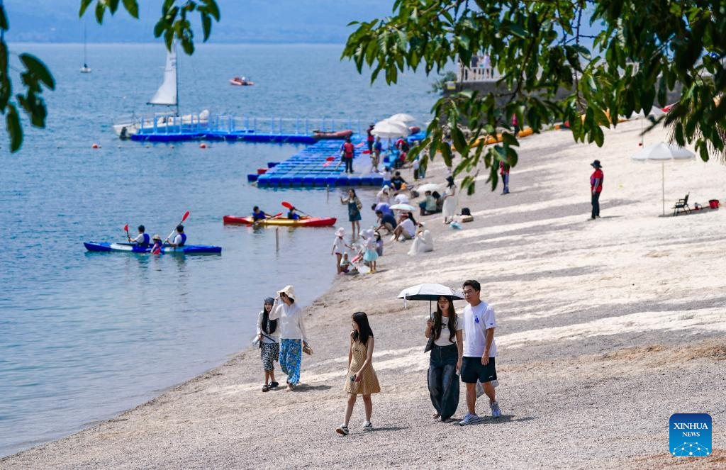 Tourists enjoy the view by Fuxian Lake in Yuxi City, southwest China's Yunnan Province on July 16, 2025. The beautiful scenery of Fuxian Lake in summer has attracted tourists nationwide. (Xinhua/Chen Xinbo)