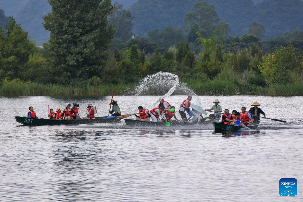 Tourists splash water on each other while rowing boats at the Puzhehei scenic area in Qiubei County, Wenshan Zhuang and Miao Autonomous Prefecture, southwest China's Yunnan Province, July 15, 2025. The beautiful scenery of Puzhehei, along with the rich amusement facilities there, has attracted lots of visitors during the summer. (Photo by Peng Yikai/Xinhua)