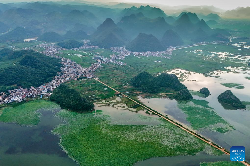 A drone photo taken on July 15, 2025 shows the scenery of the Puzhehei scenic area in Qiubei County, Wenshan Zhuang and Miao Autonomous Prefecture, southwest China's Yunnan Province. The beautiful scenery of Puzhehei, along with the rich amusement facilities there, has attracted lots of visitors during the summer. (Photo by Peng Yikai/Xinhua)