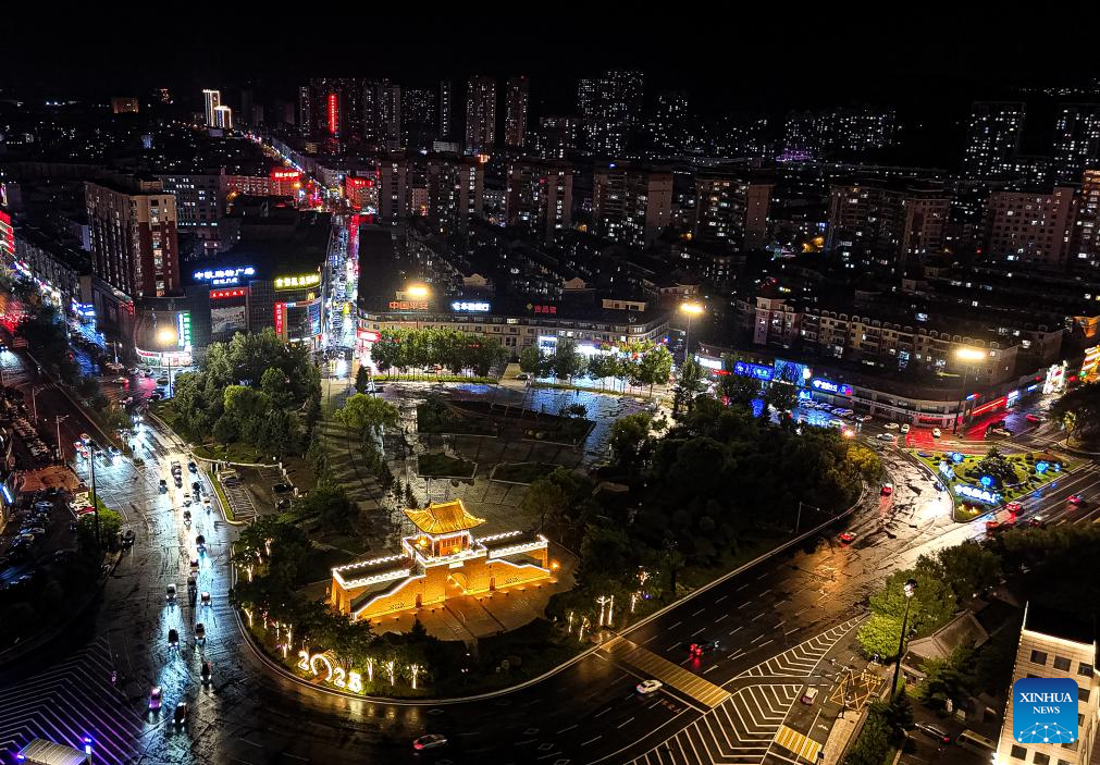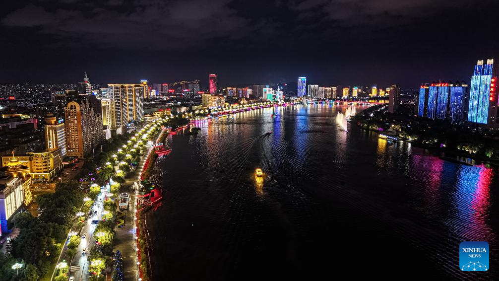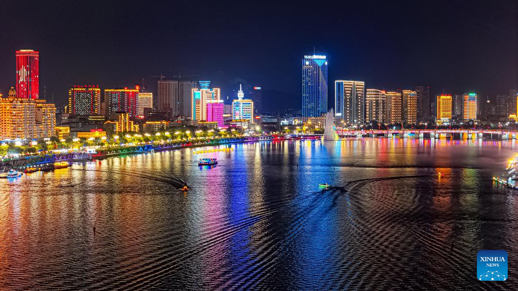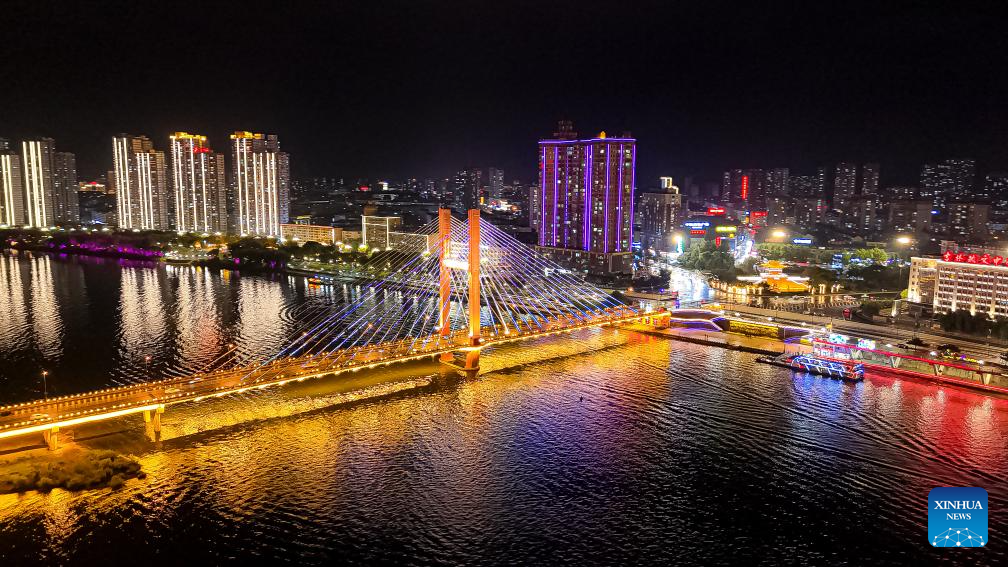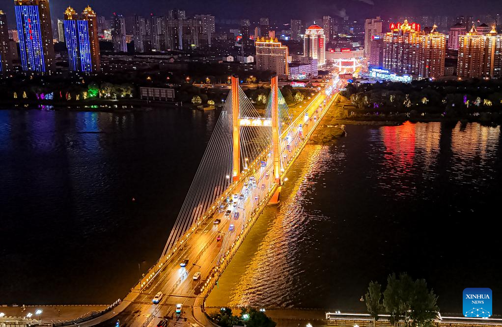 A drone photo taken on July 16, 2025 shows a night view along the Linjiangmen Bridge section of the Songhuajiang River in Jilin City, northeast China's Jilin Province. (Xinhua/Shao Zedong)