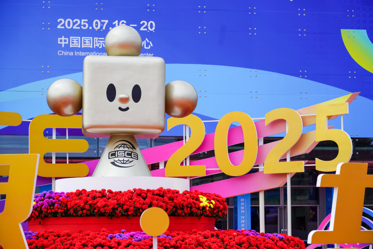 This photo shows Linky, the mascot of the China International Supply Chain Expo (CISCE), outside the venue of the third CISCE in Beijing, July 16, 2025. [Photo/Xinhua]
