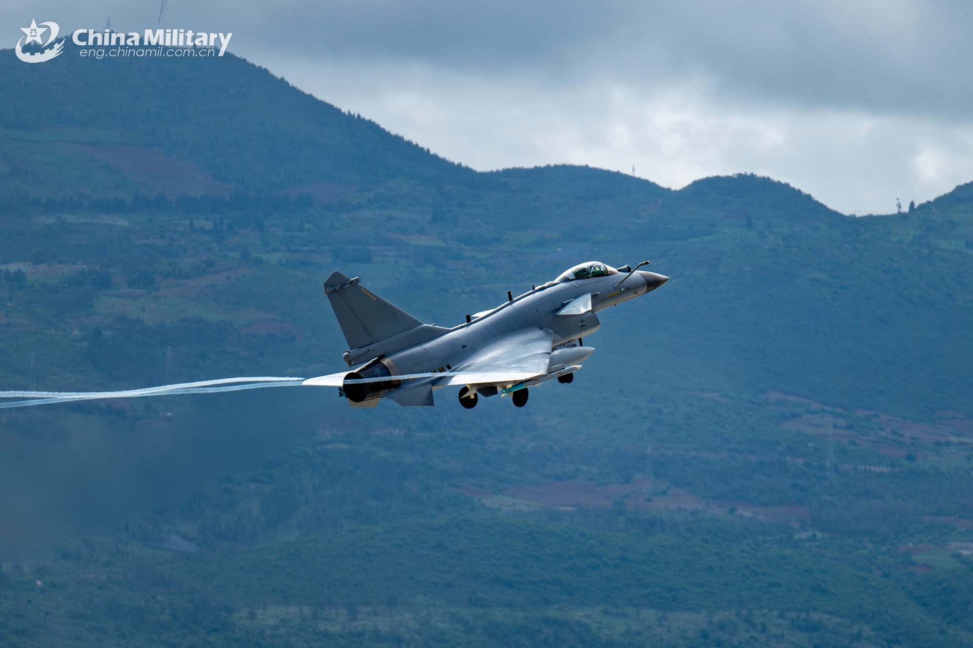 A J-10 multi-role fighter jet attached to an aviation brigade with the air force under the Chinese PLA Southern Theater Command takes off for a flight training exercise in early July, 2025. (eng.chinamil.com.cn/Photo by Xiao Rui)