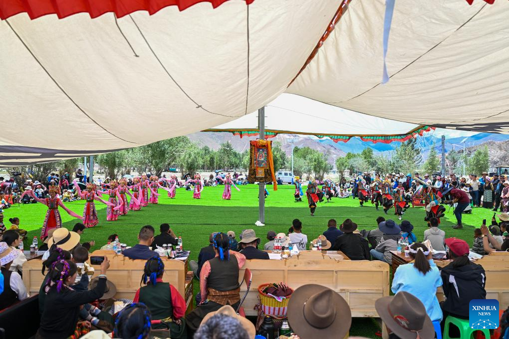 People watch Tibetan opera performance at a park in Namling County of Xigaze City, southwest China's Xizang Autonomous Region, July 16, 2025. Tibetan opera, an olden art that boasts a history of over six centuries, was listed as a national intangible cultural heritage in 2006. Namling County has stepped up in recent years to further popularize this art by regularly staging plays in the neighborhoods and training more professional performers. To date, the county is home to 29 folk Tibetan opera troupes including 876 practitioners, in addition to a 32-strong children's troupe at an average age of 9. (Xinhua/Li Xin)