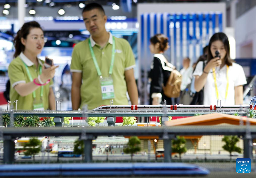 Visitors view a sand table model displayed by China Railway Rolling Stock Corporation (CRRC) at the Advanced Manufacturing Chain area during the third China International Supply Chain Expo (CISCE) in Beijing, capital of China, July 17, 2025. Themed on "Connecting the World for a Shared Future," the expo, hosted by the China Council for the Promotion of International Trade, kicked off in Beijing on Wednesday.